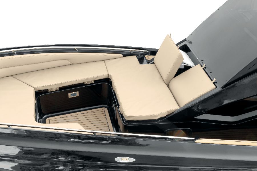 - Porte coulissante sur le côté de la console donnant accès à une zone équipée de deux pièces séparées : 1) toilettes marines avec réservoir à matières, lavabo, douche ainsi qu'un système intégré de casiers 2) chambre double et un système intégré de casiers